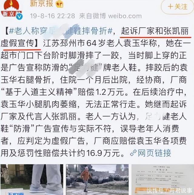 本是好事儿,可却有老人穿着号称“防滑”的鞋子摔倒了,导致右腿骨折,后续治疗并没有让老人再次站起来。 老人随即将厂商告上法庭,张凯丽作为品牌代言人,也吃上了连带官司,法院最终判张凯丽承担连带责任,事情闹大后,张凯丽和厂商还被官媒点名。